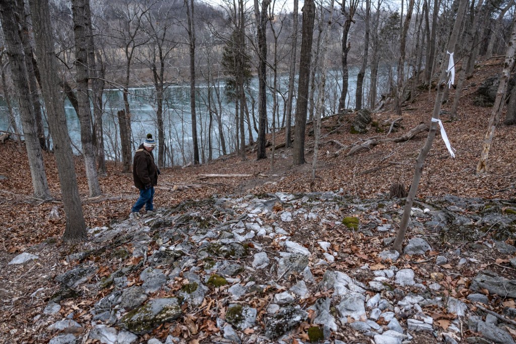 Matthew “Maasaw” Howard walks past one of a series of large burial mounds that sit on top of cliffs overlooking the Potomac River.