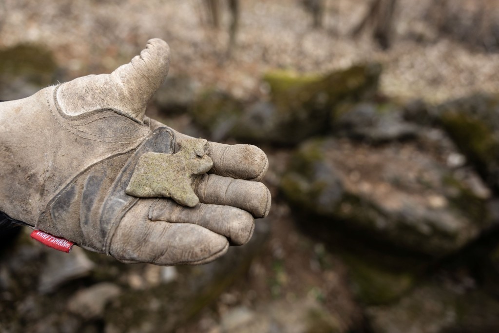 Steve Kitner holds one of the carved figurines that was lying on the edge of the crack. Many of the pieces Kitner and Howard have found around the site feature animal motifs. One of the figurines they found was a group of rocks carved to resemble a duck, with eyes pecked into its head.