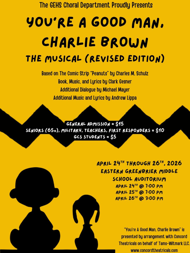 At Greenbrier East High School, the choral department is bringing this classic to life with a talented student cast. The production features Micah DeRouen as Charlie Brown, Violet Wiant as Snoopy, Hannah Gill as Lucy Van Pelt, Ella Butler as Sally Brown, Gustavo Garcia-Junceda as Linus Van Pelt, and Josiah Dehaven as Schroeder.